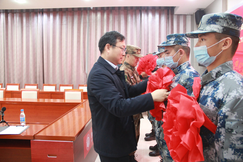 欢送会上,鼓楼区武装副部长蒋翀宣布26名新兵的定兵方向,在欢快的军乐声中领导们为全体新兵佩戴大红花并合影留念。