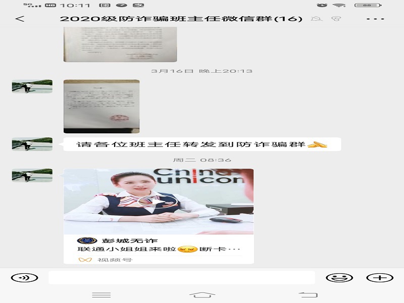 根据我校2021年校园春季安全生产工作会议精神,学院迅速成立安全生产工作小组,重点关注防电信网络诈骗宣传教育,各班迅速组建反诈骗工作专用微信群,向同学们宣传预防诈骗相关知识,不定期发布预防诈骗信息,发布最新的诈骗案例,提高同学们自我保护的意识。