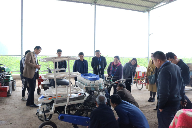 徐州市铜山区农机站站长王峰介绍了徐州汇达果蔬专业合作社的创办模式、发展历程、经验效益。作为国家“机器换人”示范点,合作社的蔬菜种植基本实现了从起垄覆膜、穴盘育苗、前期施肥、精细耕种、田间管理、采收运输的全程机械化。教师们围拢在采收平台、包菜播种、插秧机等新型农机具前,合作社负责人戴金芝一一介绍了它们的生产构造、工作原理和具体操作方法,教师们现场进行了详细的交流探讨,从专业角度就使用中存在的不足提出了改进的思路与建议。了解到合作社在农机使用中面临着一些技术问题,党总支书记王敏表示,机电工程学院师生愿意利用机械、机电控制等专业知识,为合作社提供力所能及的技术支持与服务,为推动农机机械化、智能化贡献徐工机电智慧。同时王书记还介绍了机电工程学院师生在机械创新设计上取得的一些成果,期望我院师生设计的水果采摘、简易播种机等农业机具能在示范点试验并推广使用。双方对于新型农机具的设计以及提供技术服务达成了进一步合作的意向。