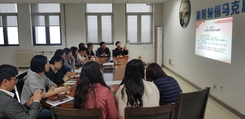 为进一步落实习近平总书记思想政治理论课教师座谈会上的重要讲话精神,提高思政课教师的理论水平和专业素养,5月14日下午,马克思主义学院组织全体专任教师在B18-1121开展“周末理论大讲堂”活动,集中收看全国高校思想政治理论课教师网络集体备课第五十七讲网络直播课,并开展课后教研活动。