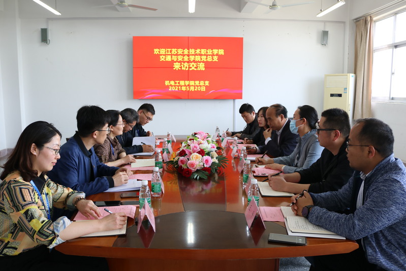 5月20日,江苏安全技术职业学院交通学院党总支书记张允志等一行6人来我校机电工程学院调研交流。学院党总支书记王敏、副书记王贵锋、副院长徐昆鹏、辅导员李德亮、黄媛媛参加座谈交流.