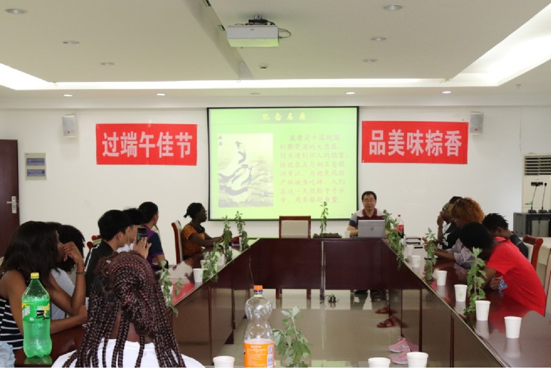 活动伊始,由国际教育学院范震波老师开展端午文化宣讲活动。他从端午节起源、端午节民俗、端午节诗词、端午文化的现代演变四个角度为留学生讲解了端午节日传统知识,纪念屈原的爱国之情、分食粽子的家庭亲人之情和插艾叶挂菖蒲的生命关爱之情,从而增进留学生对于中华民族传统节日——端午节文化内涵的认知,进而形成优秀的思想文化品格。