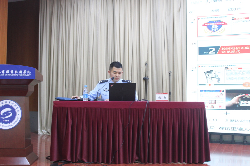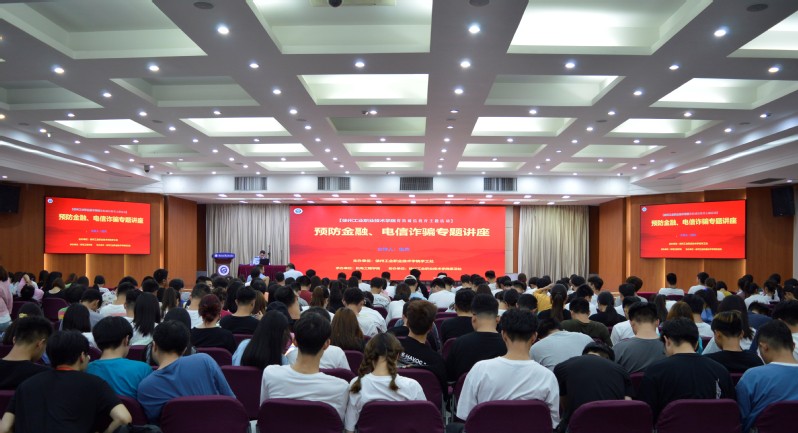 为加强我校防范金融、电信诈骗宣传,提高学生防骗意识和防范技能,6月18日下午,由学工处主办、机电工程学院承办、保卫处协办的“预防金融、电信诈骗”专题讲座在图书馆报告厅举行。本次讲座特邀徐州市鼓楼区反诈骗中心赵兵警官主讲,驻校民警令军应警官、学工处副处长秦黎明、保卫处贾翔翔,来自七个学院的四百余名学生参加了此次活动,讲座由机电工程学院党总支副书记王贵锋主持。