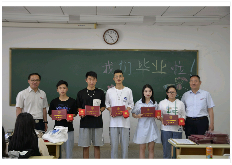 学院领导走进教室,为毕业生代表颁发毕业证书,勉励毕业生秉承“求真、求实、求精、求新”的校训,再接再厉,砥砺前行。班主任老师精心策划最后一次班会课,班会课上为学生颁发毕业证书和纪念印章,回首三年的大学时光,昨天的欢声笑语犹在耳畔,同学、老师依依惜别。最后,班主任老师召开“青春向党 奋斗强国”主题班会,引导毕业生以梦为马,不负韶华,将个人发展融入国家发展之中。