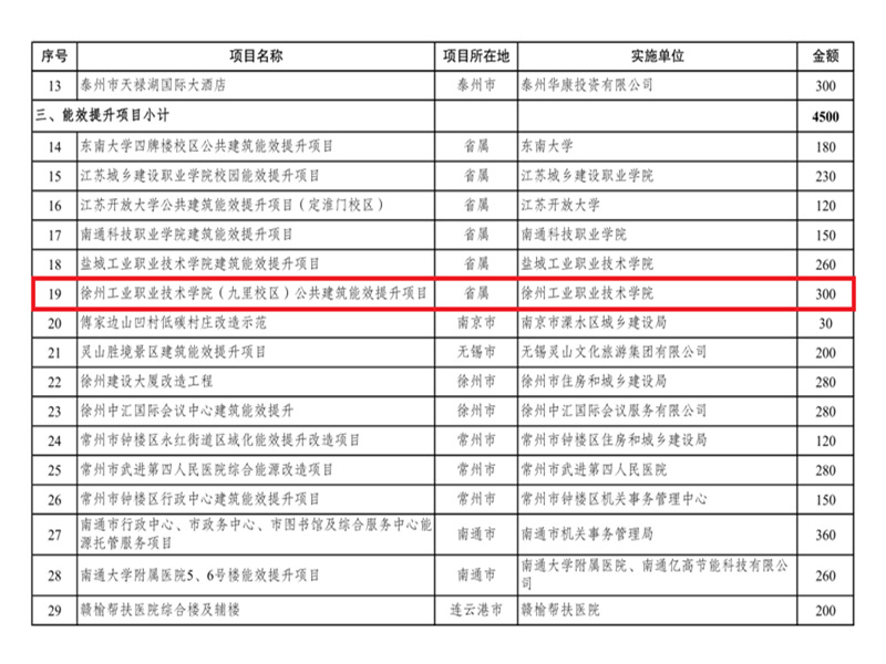 近日,江苏省住房和城乡建设厅公布了2021年度江苏省省级绿色建筑发展专项资金奖补项目,我校后勤服务中心申报的《徐州工业职业技术学院(九里校区)公共建筑能效提升项目》喜获300万元奖补资金,这是我校2013年大学科技园既有建筑节能改造工程获得省级节能减排专项引导资金以来第2次获奖,是全省省属高校唯一两次荣获省级绿色建筑发展专项资金奖补的高校,也是2021年度获奖的6所省属高校中获奖补资金最高的高校。