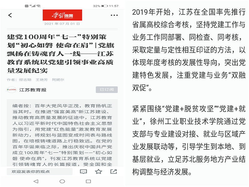 在庆祝中国共产党成立100周年之际,为总结交流和宣传推广党的十九大以来高校基层党建工作的创新方法和成功经验,江苏省委教育工委面向全省高校开展了基层党建工作典型案例征集。经评审,我校推荐的机电工程学院党总支“‘1+3+N’形成学院发展强大合力”案例成功入选“江苏高校党建工作典型案例100例”。同时,在《江苏教育报》、学习强国平台推出的庆祝中国共产党成立100周年“七一”特别策划——“初心如磐 使命在肩”中,刊发了江苏教育系统以党建引领铸魂育人的长篇报道“党旗飘扬在铸魂育人一线——江苏教育系统以党建引领事业高质量发展纪实”,报道了我校紧紧围绕“党建+脱贫攻坚”“党建+就业”,提质增效,提升党建业务“融合度”的典型做法。