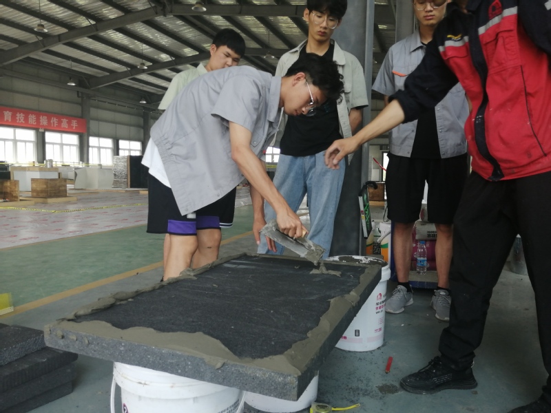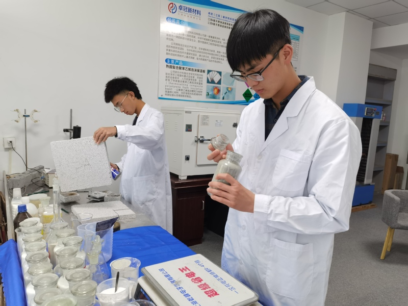 在高铁新城建筑施工现场,施工主管详细介绍了保温板安装的位置、施工步骤、安装工期等情况,通过认真倾听和记录,同学们对保温板的安装及实际应用有了初步的认识。在卓冠(江苏)新材料有限公司的实验室,同学们认真开展了保温板原料称量、物料搅拌、压制、成型等试验工作,亲身体会了保温板的生产及性能测试流程,同时提升了专业自豪感,为后续开展保温板的试验研究奠定了坚实的基础。