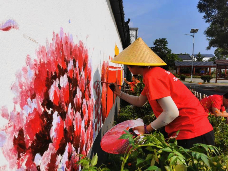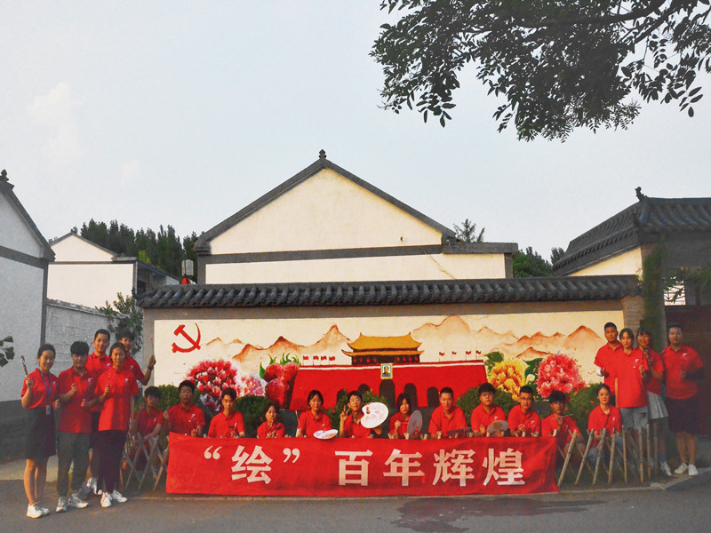作为本次实践的第三个系列主题,实践团来到徐州市贾汪区江庄镇竹园村,结合建筑装饰专业特色,对所在的墙面进行艺术加工,绘制原创“红色”墙绘作品。前期,实践团在指导老师的带领下来到竹园村进行实地调研,向当地居民了解当地风俗习惯、文化特点,为主题墙绘做足了“功课”,“绿树村边合,青山郭外斜。开轩面场圃,把酒话桑麻”,身处其中,仿佛置身婉约的江南小山村。7月24日上午,团队一行20人来到实践现场,在与村支书充分沟通后,挑选具有代表性的天安门广场作为主图,开启了作品绘制。队员们分工明确,相互配合,他们顶着烈日,从调色、打底到涂色,相互合作、配合默契,每一幅画都倾注了同学们的心血,吸引了众多村民前来驻足观看。说起未来的发展,竹园村的崔书记说道:“下一步,我们村除了要打造生态宜居、乡风文明的新农村,还要大力发展旅游业,打造精品民宿,开发旅游产品,如今‘红色墙绘’的加持,有望让竹园村成为红色宣传教育基地和周边市民喜爱的休闲打卡地。”