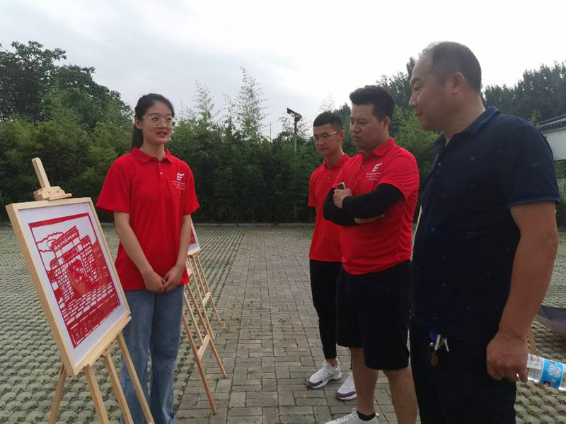 将传统剪纸艺术赋予新的时代内涵,以非遗的魅力引导学生学党史、感党恩、跟党走,用一幅幅红色剪纸作品,讲述党史故事,是本次实践的第二个系列主题。前期同学们采用PS、AI等软件制图的方式原创绘制,灵活运用天安门广场、人民英雄纪念碑等耳熟能详的红色元素,后进行剪纸加工,装裱,并在徐州市贾汪区竹园村实践基地进行宣传讲解。每一幅剪纸都是一段党史缩影,蕴含着丰富内涵的非遗作品,令前来参观的人们不禁点赞。在展出系列作品的同时,同学们还在当地开展了“剪纸背后的故事”系列红色故事宣讲,深入浅出的为大家带来《赶考出发地——西柏坡》、《伟大的转折——遵义会议》、《红色延安形象——宝塔山》等红色小故事。竹园村的崔书记说道:“这种学党史的形式很新颖,我们觉得蛮有趣的,许多作品十分形象、很生动,让我们认识了历史,学到了知识。”