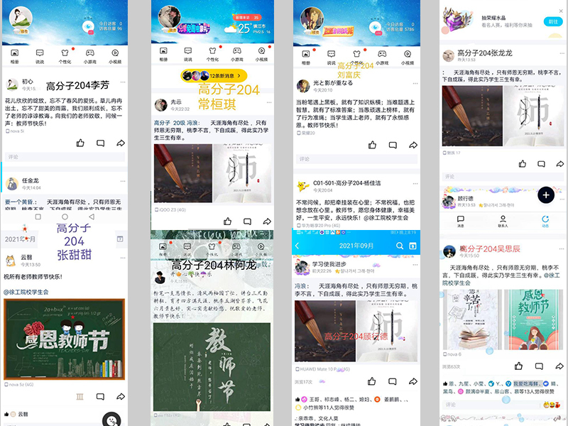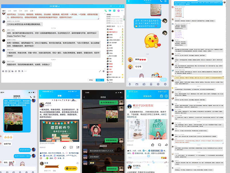 因为疫情原因,目前同学们与老师们只能在家上网课,但丝毫不影响同学们对老师的思念之情。材料学院学生会的同学们通过手机短视频录制千里传音,为老师们送上最真挚的祝福;高分子201班、高分子203班、高分子204班、高分子(4+0)201班及学生社团的同学们利用QQ、微信等新媒体,在班级微信群或QQ空间为老师送上祝福,皮具201班的同学纷纷晒出同学与老师之间的合影,分享背后令人难忘的故事。话短情长,每一个分享、每一句祝福,都饱含他们对老师们的感恩及爱戴之情。