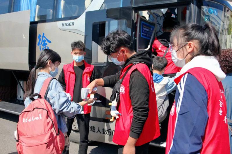 规范流程更“安心”。为了提升迎新服务效果,前期,团委在西门报告厅以线下和线上会议的形式召开了全体迎新志愿者培训大会、各站点负责人分工布置会,从疫情防控、个人安全、组织纪律、迎新流程、突发事件处理等方面进行了细致的讲解,并进行了反复演练。迎新现场,志愿者们组织新生排队,依次查验身份证、录取通知书、校园驿站绿码,并在上车前开展体温测量,保障新生能够安全入校。志愿者们还拿出自己的工作餐与中午时间到站的同学一起分享。