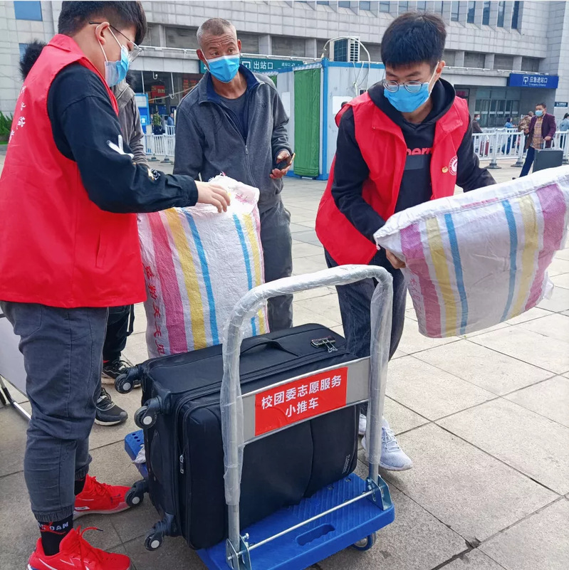 应急装备更“贴心”。考虑新生集中到校行李多、人流量大等实际情况,校团委准备了20余辆志愿服务小推车,从新生到达车站到校内完成核酸检测,志愿者为新生提供“一站式”行李搬运、包裹代管等细致服务,并准备了包含口罩、酒精湿巾、酒精凝胶、晕车药、创可贴、风油精等物品在内的应急医药包以备不时之需。因疫情原因,家长不能陪同学生入校,志愿者们以疏化堵,通过分享校园环境照片、分享迎新现场视频等方式,顺利消除了家长顾虑。