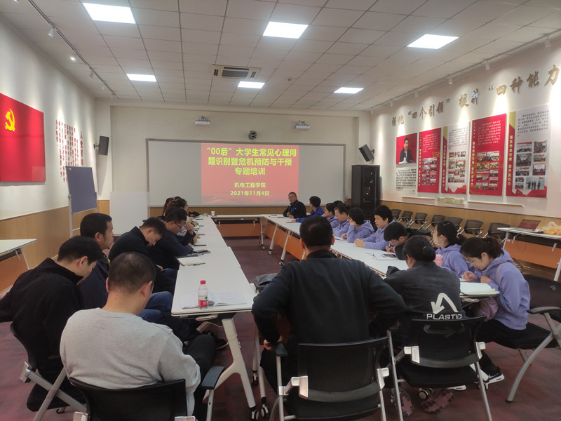 为更好开展学生心理健康教育工作,为学生健康成长保驾护航,11月4日上午,机电工程学院邀请到我校大学生心理健康教育与咨询中心主任马千珉老师在图书馆1楼智慧党建室开展主题为《“00后”大学生常见心理问题识别暨危机预防与干预》专题培训。学院高度重视,院党总支书记王敏、党总支副书记王贵锋、全体辅导员、班主任参与到本次培训中,培训由王贵锋副书记主持。