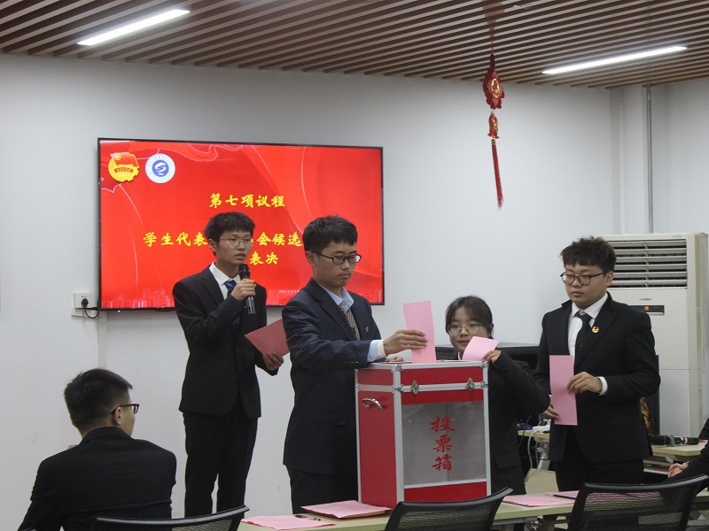 随后,第十一届学生会主席团成员赵小伟宣读了学生会候选人选举条件和关于学联学生会工作人员改进作风服务同学的若干规定;团总支学生副书记史为旭汇报了此次学生代表大会筹备工作、学生会候选人名单及情况介绍和机电工程学院学生会改革情况报告。之后,各位代表认真填写并亲手把选票庄重地投进了投票箱。会议选出了第十二届机电工程学院学生会主席团成员;接着机电工程学院第十二届学生会执行主席华轩浩表态发言,表示今后将团结带领学生会全体成员,用青春的梦想之火激励自己,为学校和学院的建设和发展努力奋斗。