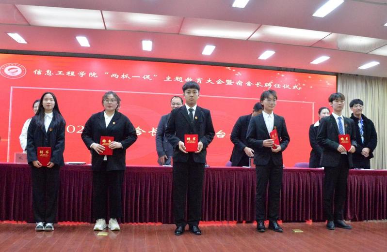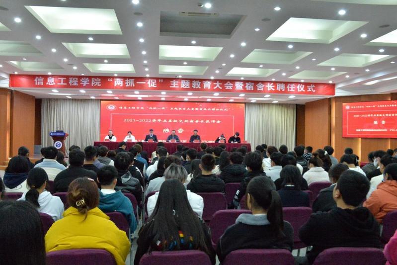 为加快推进“两抓一促”主题教育活动落细落实,加深学生对“两早一晚”、“五不学风班”、“三讲三无”的理解,更好建设“明德尚美,室雅人和”的宿舍文化氛围,促进文明校园创建,信息工程学院于11月24日下午在图书馆报告厅举行“两抓一促”主题教育大会暨宿舍长聘任仪式。信息工程学院党总支书记刘海涛、学工处副处长巩庆伟出席会议,学院2020级、2021级全体辅导员参加本次活动。会议由信息工程学院党总支副书记韩永印主持。