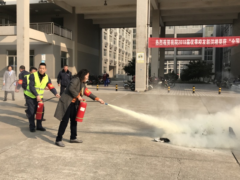 第四阶段由机电工程学院党总支组织教师与部分学生进行灭火实战演练,培训员从如何报警、如何扑救初期火灾、如何疏散、灭火等知识进行详细讲解,并现场演示了干粉灭火器、室内消火栓等消防器材的使用方法,组织师生逐一使用灭火器灭火,进一步深化培训效果。