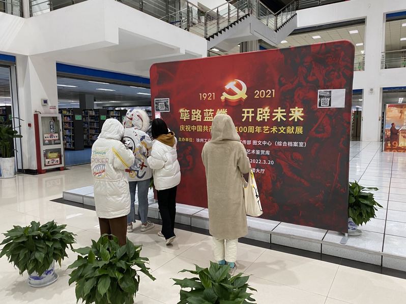 为庆祝中国共产党成立100周年,深入开展党史学习教育,“筚路蓝缕·开辟未来”艺术文献展在图书馆二楼大厅拉开帷幕。本次展览以画为体、以史为据,用一幅幅精美的艺术作品展现了中国共产党100年峥嵘岁月。整个展览分为四大篇章,每一篇章又分设不同单元,形成总主题引领和不同单元展开的结构,结合历史与艺术作品来呈现展览。让观者沿着党的足迹,回顾党的光辉历程,有力地激发起观者对党的丰功伟绩的崇高敬意,传承奋斗精神,凝聚时代力量。