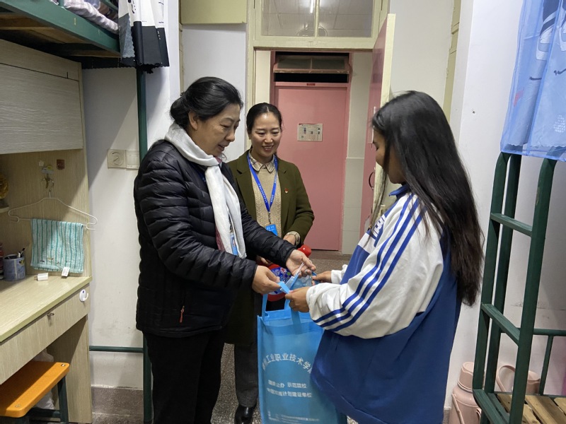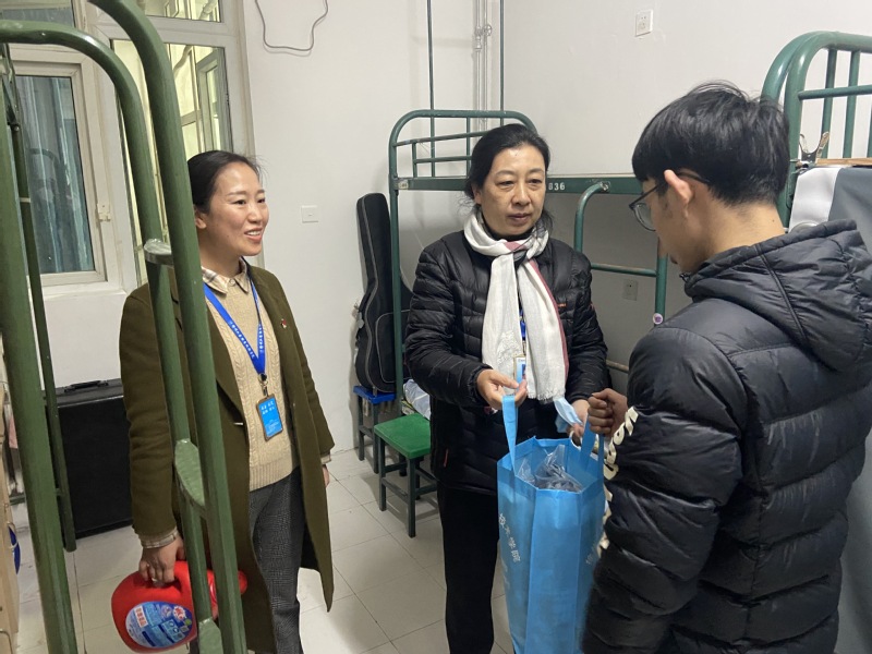 活动中,学院领老师们来到学生宿舍走访慰问家庭经济困难学生,在宿舍里亲切地同学生们交流,关心学生的近期学习及生活状况,并向学生们送上了温暖慰问礼包。慰问过程中,李素婷书记叮嘱同学们要做好疫情防控常态化下个人健康防护,加强体育锻炼,提高身体素质;倡导同学们在学校“两抓一促”良好氛围中,养成文明习惯,提升文明素养;鼓励同学们要感恩国家和学校的资助,发愤图强,提升专业素养,用爱心回馈社会。