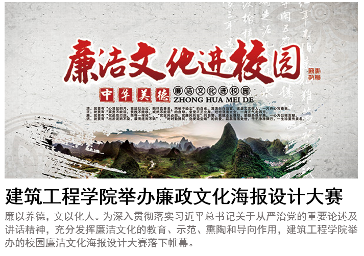 廉以养德,文以化人。为深入贯彻落实习近平总书记关于从严治党的重要论述及讲话精神,充分发挥廉洁文化的教育、示范、熏陶和导向作用,建筑工程学院举办的校园廉洁文化海报设计大赛落下帷幕。活动自11月中旬开始预选,受到了同学们的热情关注,百余名同学以个人或团队的形式踊跃报名参赛。经评定小组集中评选,在征集的100多幅优秀的作品中,评选出30余幅进行线上展示。