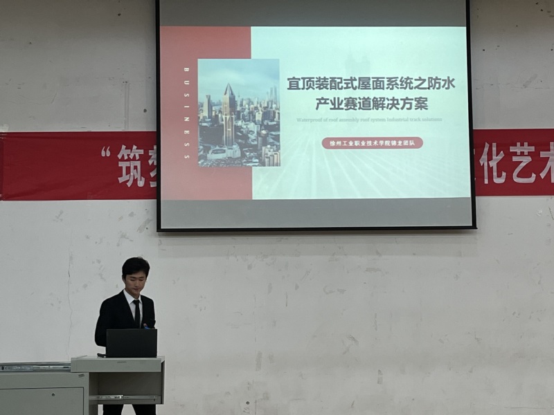 紧接着锦龙同学展示了他的团队项目——“宜顶装配式屋面系统之防水产业赛道解决方案”。宜顶屋面系统分为定型体系和用户可选体系,“双层设防”宜顶(EDEE)屋面系统构造层次包括基体防水保障系统、层间排水系统、保温系统、衬垫防水系统、滞水型雨水收集压铺系统和景观压铺系统,提供了多重保障。同时宜顶(EDEE)工业化装配式屋面系统系依托轻质的高强度保温材料、先进的紧固件,完善的系统配件,在多种结构基层上实现了屋面体系的整体工业化装配。