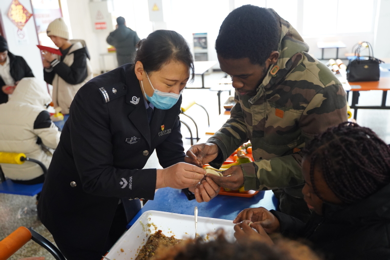 “清水飘芙蓉,元宝落玉盘”。包煮饺子活动开始了。出入境警官们和留学生团团围坐,手把手地教起来他们包饺子。拌馅、揉面、擀皮,不一会儿,一盘盘晶莹剔透的水饺纷纷就出炉了,醇香的水饺裹满了留学生美好的祝愿和祈盼,更裹满了世界各民族间的深情厚谊。