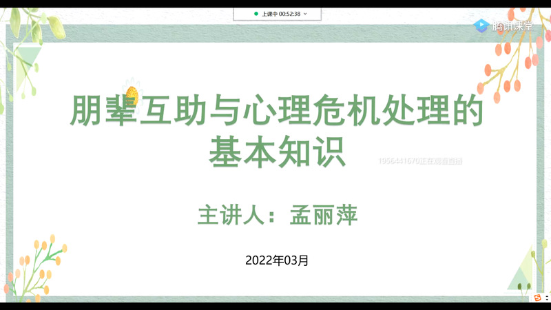 专题培训“强心技”。3月23日,学院所有班级召开了“心向阳光,拥抱未来”主题班会课,班主任老师和同学们一起分析和探讨了大学生常见的心理问题及成因,并提出了应对的思路和方法,引导同学们学会接纳自己的负性情绪,并进行积极自我暗示,合理宣泄情绪并掌握自我放松的方法和技巧;班主任老师还介绍了校大学生心理健康中心及二级学院心理健康教育工作站心理咨询值班情况。3月27日,孟丽萍老师面向全体心理委员和信息员开展线上专题培训,孟老师详细讲解了朋辈互助与心理危机处理的基本知识,通过培训进一步提升心理委员和信息员的工作认知,增强他们的服务意识和责任意识,为更好发挥他们在学生心理健康教育工作的积极作用奠定了良好的基础。