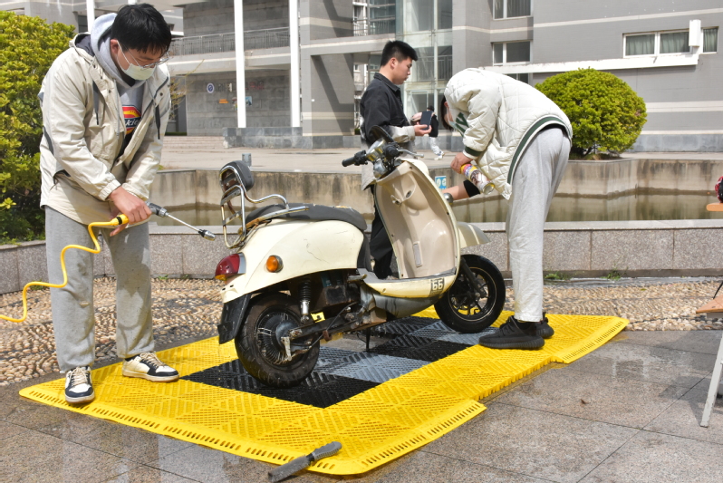 3月26日,汽车社团志愿者在喷泉广场开展电动车检查维修保养志愿服务活动。活动中,志愿者认真排查电动车存在的潜在问题,并提供线路焊接、轮胎充气、刹车调试、注入润滑油等力所能及的维修服务,同时学生会同学在活动现场准备了自助洗车设备供师生免费使用,还向现场同学宣传电动车充电注意事项。志愿者们凭借扎实的专业知识与技能帮助同学维修保养电动车,受到了同学们的一致好评。