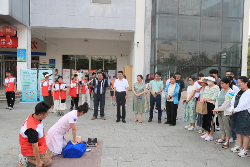 校卫生所医务人员通过现场对“模拟人”进行施救,详细讲解如何实施现场观察险情、问询、呼救、报警,并进行处理口腔和气道、胸部按压和人工呼吸操作演示。现场师生通过专业医务人员的讲解和示范,明确急救的方法和动作要领,掌握心肺复苏技能和相关急救知识。