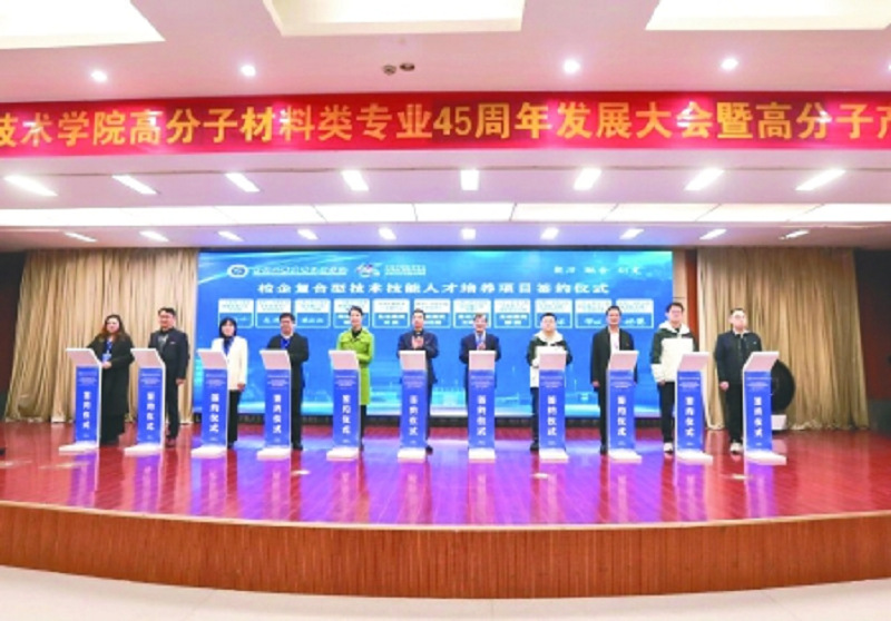 会上,学校与江苏江昕科技股份有限公司、广东新劲力精密机械有限公司等企业签署了复合型技术技能人才培养协议。全国石油和化工职业教育教学指导委员会发布的《高分子行业学习成果认证标准》,将为行业人才能力评价与衔接提供依据。