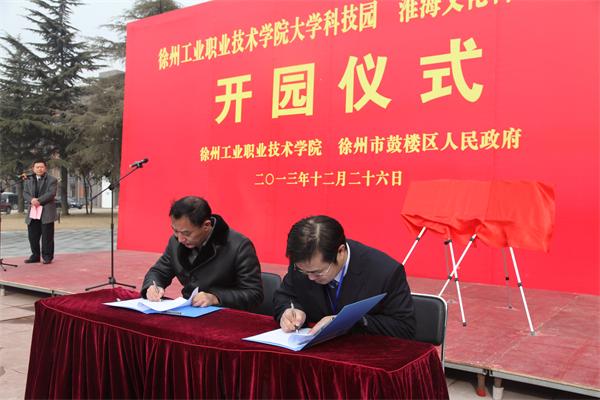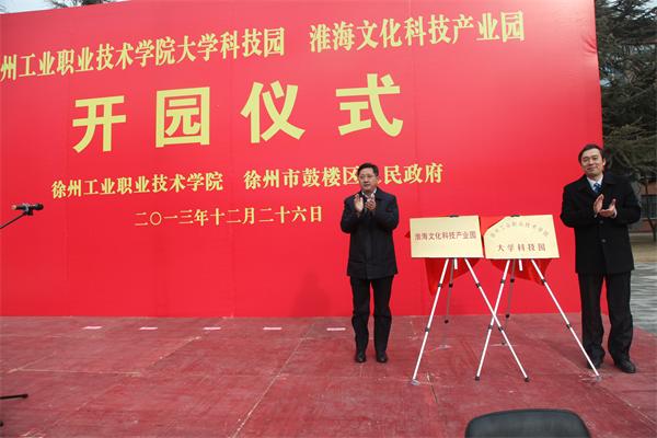 徐州市委常委、市委宣传部部长冯其谱与校长祝木伟共同为徐州工业职业技术学院大学科技园与淮海文化科技产业园揭牌。