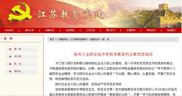 为了深入践行党的群众路线和社会主义核心价值观,进一步夯实党员同志为民服务的意识,不断推进服务型党组织建设,近期,徐州工业职业技术学院各基层党组织纷纷以“学习贯彻党的十八届四中全会精神,努力践行社会主义核心价值观”为主题,精心谋划,认真实施,开展了形式多样、特色鲜明的系列党日活动。