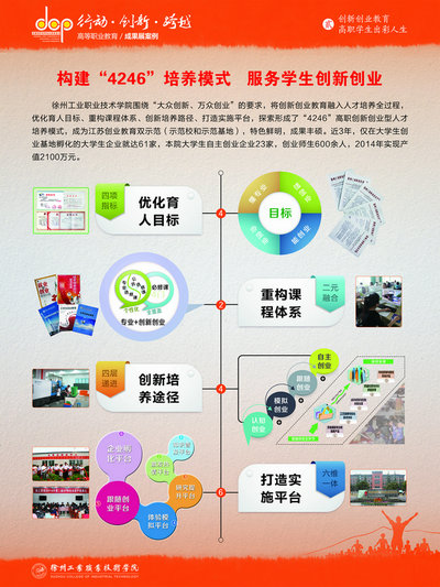 近年来,我校围绕“大众创业、万众创新”的要求,将创新创业教育融入人才培养全过程,优化育人目标、重构课程体系、创新培养路径、打造实施平台,探索形成了“4246”高职创新创业人才培养模式,成为江苏创业双示范(示范性和示范基地),特色鲜明,成果丰硕。近3年,仅在大学生创业基地孵化的大学生企业就达61家,本校大学生自主创业企业23家,创业师生600余人,2014年实现产值2100万元。