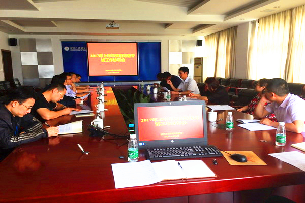 教务处张达志老师汇报了江苏省教育考试院关于2017年上半年全国大学英语四、六级考试考务工作会议精神,并结合会议精神对我校考试考务工作提出了针对性的安排建议,并总结历次考试考务工作的经验,对各部门的工作职责进行了解读和说明等。