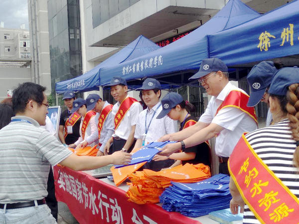 为全面贯彻习近平总书记关于节水优先方针的重要论述,落实党的十九大关于实施国家节水行动的部署以及省、市有关节水行动, 5月16日上午,徐州市水务局联合我校在第二食堂东广场开展了以“实施国家节水行动,让节水成为习惯”为主题的“2018年全国城市节约用水宣传周”活动。水务局相关领导、副院长朱作付、国有资产管理与后勤服务中心副主任杨宏楼、刘继峰等参加了活动。