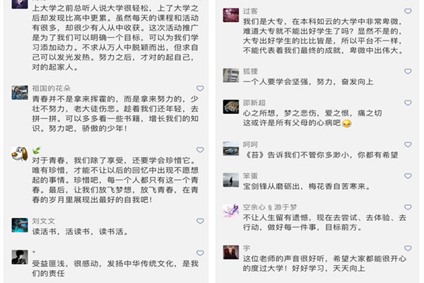 栏目自推出以来,反响热烈,广大教师和同学们纷纷转发、评论和点赞。为了深化学习效果,扩大影响范围,信电学院还开展了“诗词荐读进晚自习”主题活动,组织同学们通过“读、听、议、悟”四个环节,深入学习中国优秀传统诗词,深入理解文章传递的精神内涵。截止现在,诗词荐读栏目微信累计阅读量近两千余次,评论达千条,计算机应用172班徐圣杰同学说:“诗词荐读,书香盛会,每期内容都是老师们精心准备的一道精神大餐,让我们受益颇深”。