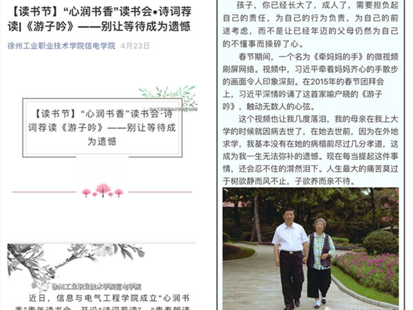 根据中共中央办公厅、国务院办公厅印发的《关于实施中华优秀传统文化传承发展工程的意见》精神,信息与电气工程学院围绕立德树人根本任务,遵循学生认知规律,将中华优秀古诗词融入大学生网络思想政治教育,在学院微信公众号推出了“心润书香”读书会诗词荐读栏目,旨在潜移默化中提升学生的人文素养和道德情操。