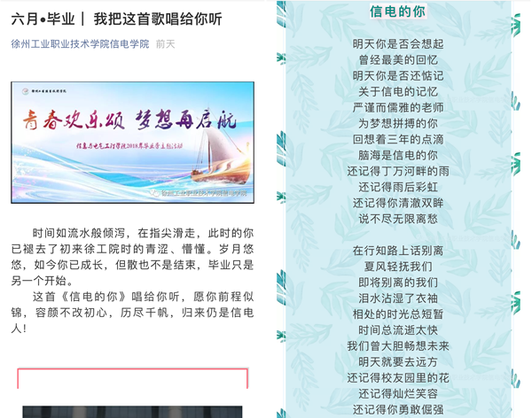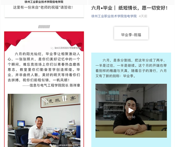 为怀美好的大学生活,记录毕业生三年的青春成长历程,信息与电气工程学院教师代表改编并演唱《信电的你》,歌曲贴近校园、充满青春正能量,触发学生对大学美好生活的回忆,受到了师生热捧;学院领导班子和2015级班主任老师,精心撰写毕业寄语,深情的希望浓缩在字里行间,祝福毕业生不忘初心,继续前行;学院2016级和2017级学生怀着对学长学姐的深深情意,录制《纸短情长,愿一切安好》视频,分别从“我最难忘的学长学姐”、“学长学姐成长故事”、“学长学姐给予我的帮助”、“毕业祝语”等四个部分,将离别的情谊化成最美的祝福。毕业歌曲、寄语、视频一经网上发布,立刻吸引大量学生的关注、留言和转发,同学们纷纷表示感人、难忘、幸福、感恩母校。不仅如此,各个班级还举办了形式新颖的主题活动,电气自动化151班收集了毕业生大学生活中的留影,并配以精美的装饰和感人的语言,为班级同学独家制作了《青春不散场》台历,每一本台历都是私人订制,都见证了学生三年大学时光的缩影,内容丰富而温馨,语言感人而励志。