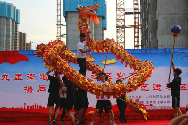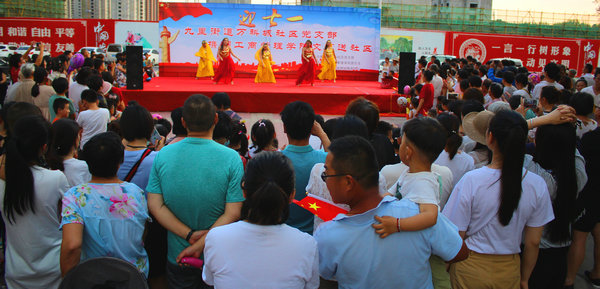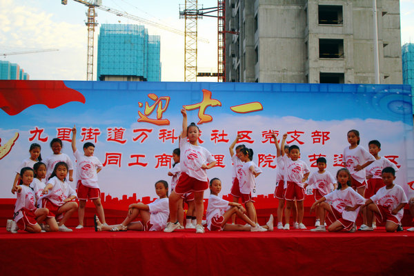 在九里街道的大力支持下,实践团师生经过近一个月精心组织,紧张排演,6月27日下午在万科社区举办了文艺汇报演出。文艺汇演受到了社区居民的热烈欢迎,千余名群众观看了汇报演出。