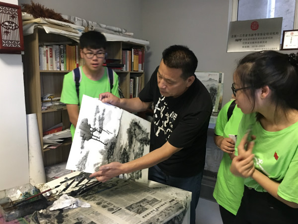 最后,老党员带领学生党员重温入党誓词并合影留念,嘹亮的誓言久久回荡在村委会的上空。座谈会结束后,师生来到老党员郭广海和陈刚的家中,和老党员促膝交谈,75岁的老支书郭广海,虽已退休,但仍在做些自己力所能及的事情,发挥余热,做到退休不退志。他勉励大学生党员们道:“要看到伟大成就的同时,也要认识到发展的不足。改革开放不是终点,而是继续前行。”陈刚同志是徐州市著名画家,在陈老师的邀请下,大家参观了他的画室,陈老师热情洋溢的为同学们介绍了中国山水画的画法和意境,同时,鼓励同学们学习和传承中国传统文化,将中华五千年灿烂文明发扬光大,陈刚老师还在现场即兴创作了一幅画作,并撰写了一幅寄语,赠予实践团的学生党员们,勉励他们“不忘初心,来自人民,回馈人民”。