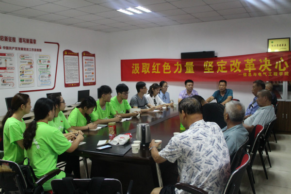 近日,信息与电气工程学院暑期社会实践团在4名老师的带领下来到徐州市云龙区大郭庄街道下河头村,和老党员们一起开展“汲取红色力量,坚定改革决心”庆祝改革开放四十周年主题实践活动。