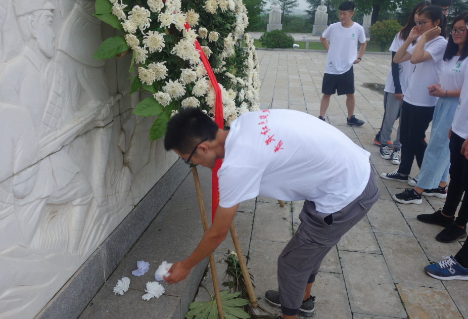 7月11日,团队来到了徐州小窑头烈士陵园,陵园位于新沂市东阿湖古镇境内,设八个园区,建造墓碑五百余,安葬自抗日战争以来革命英烈二千多人。阿湖为苏北红色革命老区,包括阿湖人民在内的新沂人为民族独立和人民解放付出了巨大牺牲,他们东设“臭狗阵”,西摆“火鸡阵”,消灭日伪近百,可谓智勇双全。队员们参观了烈士园区,献上自己手工制作的小白花,缅怀200和余位先烈,鞠躬行默哀礼,表达青年学子对烈士的缅怀和敬意。