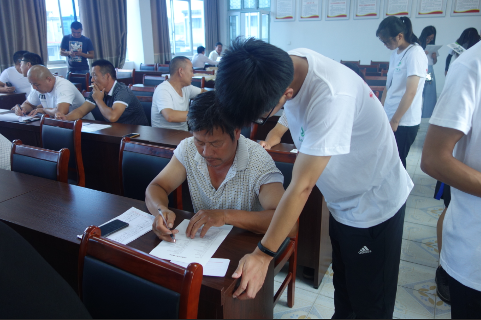 村民们对团队的到来表示了热烈的欢迎,在村民活动室中,队员们与村民进行细致的交流。随后,团队成员一对一指导村民填写问卷调查,发放“环境友好型除草地膜”宣传册,耐心讲解除草地膜的功效和用法。参加交流的村民大多数是年龄偏大的女性,遇到不识字、眼神不好、听力不佳和发音不清的方言村民,队员们耐心解释、反复校对并提供帮助。