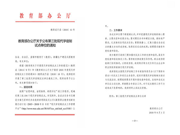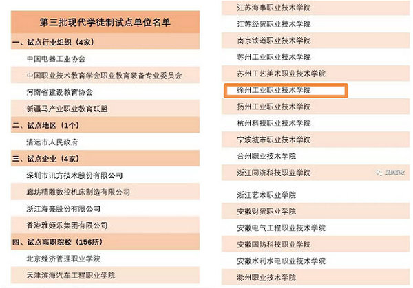 近日,教育部办公厅印发《教育部办公厅关于公布第三批现代学徒制试点单位的通知》(教职成厅函〔2018〕41号)文件,我校成功获批教育部第三批现代学徒制试点单位,是江苏省17所国家现代学徒制试点高职院校之一。