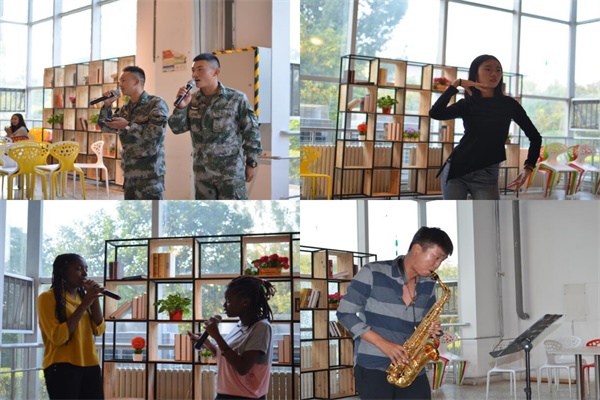 在月饼蒸制过程中,大家围坐在一起尽情联欢,首先是两位教官为同学们带来歌曲“纸短情长”,在悠扬的歌声中大家情不自禁的跟着哼唱了起来。大一新生文晶晶同学的缓歌缦舞,如初生芙蓉萍水而出,尽态极妍。薛冠华同学的萨克斯独奏,细腻委婉,清新悠扬,音色优美。茱莉亚和莉莉两位留学生为同学们带来了歌曲“朋友”,一曲朋友唱出了他们的心声,赢得了同学们的阵阵掌声。