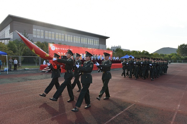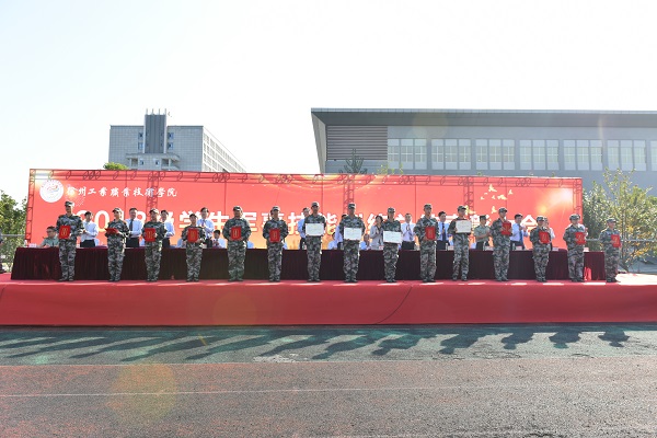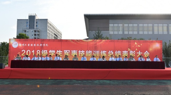 9月30日上午,我校2018级学生军事技能训练总结表彰大会在体育场隆重举行。党委书记祝木伟、院长张登宏,党委副书记李红、副院长鲍桂楠、副院长张芳儒、纪委书记徐勇、副院长朱作付,党委委员、组织部部长朱伟军,党委委员、宣传部部长乔向东,承训单位陆军工程大学训练基地政治工作处处长王耀勇主任、28大队吴晓斌副大队长、军训团团长李二站,以及各职能处室负责人和各二级学院的党政负责人、负责军训工作的副院长出席了本次大会。大会由武装部部长张海波主持。
