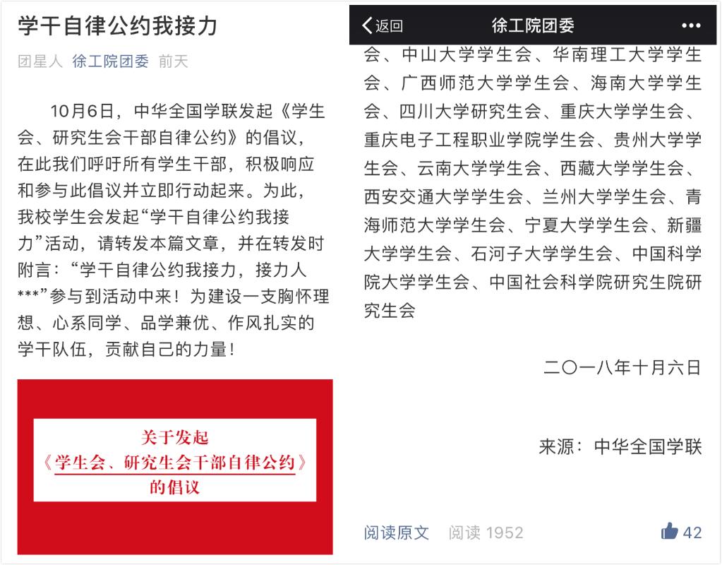 10月6日,中华全国学联发起《学生会、研究生会干部自律公约》的倡议,当天,我校学生会积极响应,发起“学干自律公约我接力”活动,呼吁全校所有学生干部响应和参与此倡议并立即行动起来,为建设一支胸怀理想、心系同学、品学兼优、作风扎实的学干队伍贡献力量。