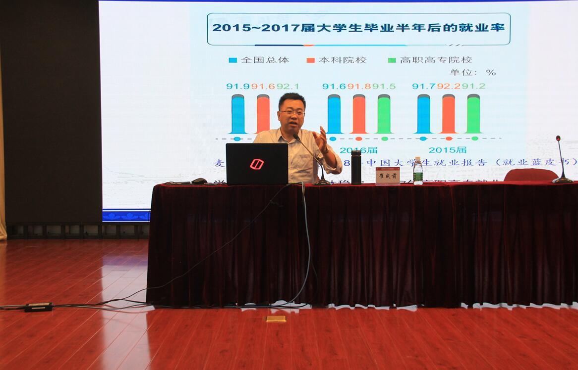 10月24日下午,由江苏省高校招生就业指导服务中心主办、我校大学生就业指导服务中心承办的“2018年大学生就业创业指导公益巡讲”在图书馆多功能报告厅举行。江苏省大学生就业创业专家,江苏师范大学党委学工部部长崔成前应邀做了主题为“基于职业素养拓展的生涯发展”的专题讲座。我校大学生就业指导服务中心工作人员及各二级学院就业干事和300余学生代表共同聆听了讲座。讲座由大学生就业指导服务中心副主任宁军胜主持。