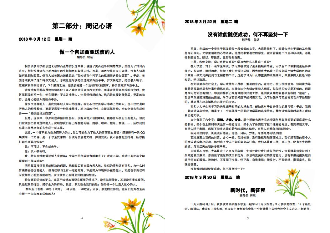 第二部分“周记心语”中,收录了2018年3月至8月辅导员周记,在周记中,既有发人深省的《做一个向加西亚送信的人》和《没有谁能随便成功,何不再坚持一下》,又有答疑解惑的《新时代的共青团究竟是干什么的?》和《同学,你为什么要读书?》;既有指明方向的《勇于突破自我边界》和《立志做新时代奋斗青年》,又有写给2018级新生的《愿你不负韶华,逐梦工院》。周记的一笔一画无不渗透着辅导员对学生浓浓的爱,如春风化雨般滋养着他们不断成长。