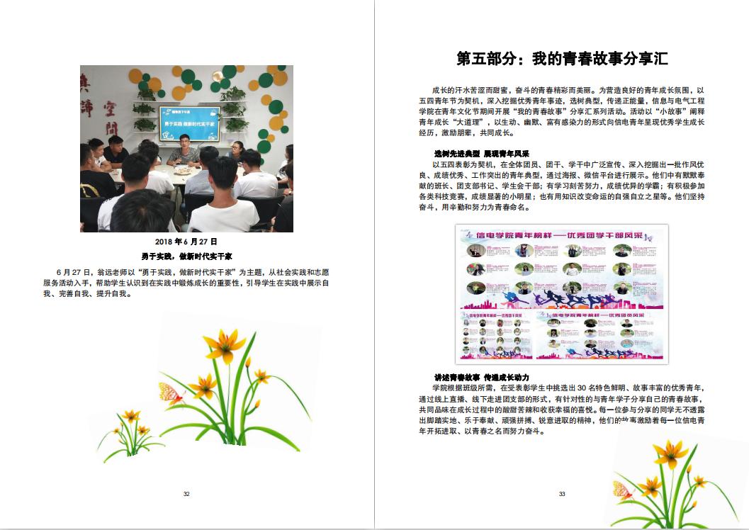 第五部“我的青春故事汇”,通过深入挖掘优秀青年事迹,选树典型,通过海报、微信平台进行展示,同时以线上直播与线下交流相结合的方法,引导信电青年结合自身特点,以不同的优秀典型为榜样,积极规划学业生涯,用奋斗成就自己的出彩青春。