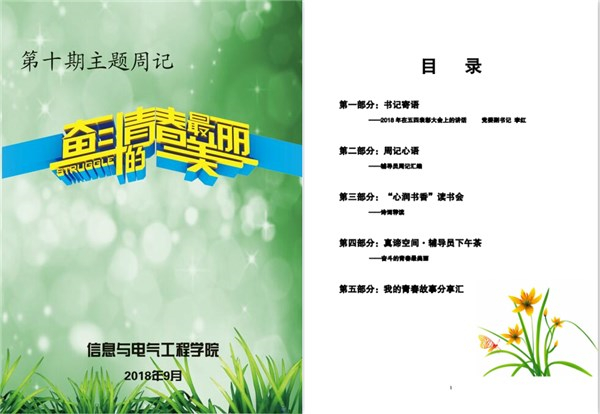 信息与电气工程学院第十期主题周记《奋斗的青春最美丽》向学生暖心发放。本期周记由“开卷语:书记寄语”、“周记心语——辅导员周记汇编”、“心润书香读书会——诗词荐读”和“真谛空间·辅导员下午茶”等部分组成,寄语青年学生坚定理想信念,加强品德修养,珍惜学习时光,培养奋斗精神,努力成为德智体美劳全面发展的社会主义建设者和接班人。
